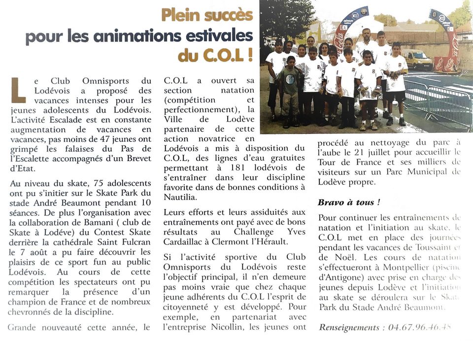 Le samedi 5 juin 2021, le C.O.L. fêtera ses 30 ans. Des festivités étaient prévues cette année, mais ‒ COVID oblige ‒ nous avons dû en reporter la date vers des jours meilleurs. Nous pourrons alors nous remémorer des grands moments du C.O.L. comme, par exemple, en 2002 lors de l’étape du Tour de France à Lodève où tous les licenciés de la section Natation du C.O.L. avaient contribué à la réussite de ce superbe weekend sportif en assumant le nettoyage du Parc Municipal entre le National de Pétanque et l’installation du village du Tour de France : encore une prouesse ! De plus, nous avions pu échanger avec la mascotte de vélo français, Raymond Poulidor (disparu il y a peu). D’autres articles sur l’histoire du club vous seront proposés régulièrement dans le cadre de ces commémorations.